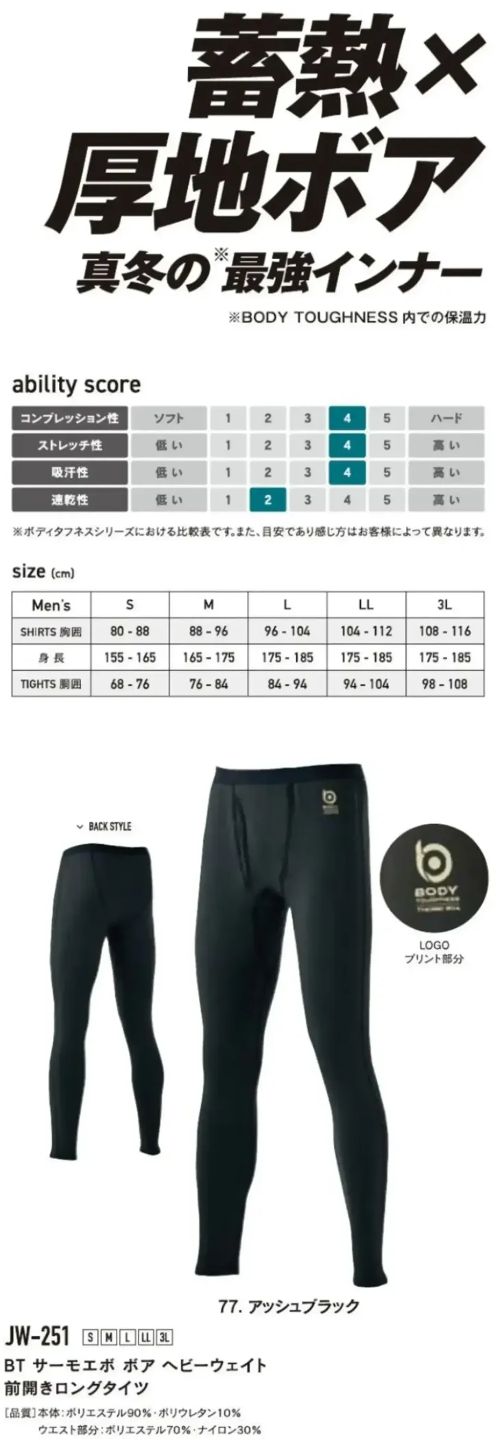 JW-251 BT サーモエボ ボア ヘビーウェイト 前開きロングタイツ