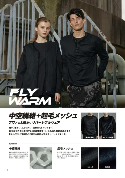 FLY WARM(フライウォーム)シリーズ。中空繊維と起毛メッシュのダブル構造で、軽くてふんわりと暖かいリバーシブル仕様のロングスリーブシャツです。繊維内部に空気を多く含む中空ポリエステル素材が高い保温力を発揮し、内側の起毛メッシュがムレを抑えつつドライな着心地をキープ。裏表どちらも着用できる2WAY設計で、保温面・スタイリング面の両方に対応します。軽量で動きやすく、秋冬の屋外作業やアウトドアにも最適なミドルレイヤーウェアです。
