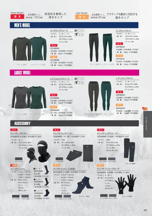 オンヨネ独自のハイブリッド素材が高いドライ性能を発揮。保温性を重視した厚手タイプです。伸縮性にも優れ、立体カッティングとの相乗効果で運動性能も抜群。-10℃前後の環境で活躍。