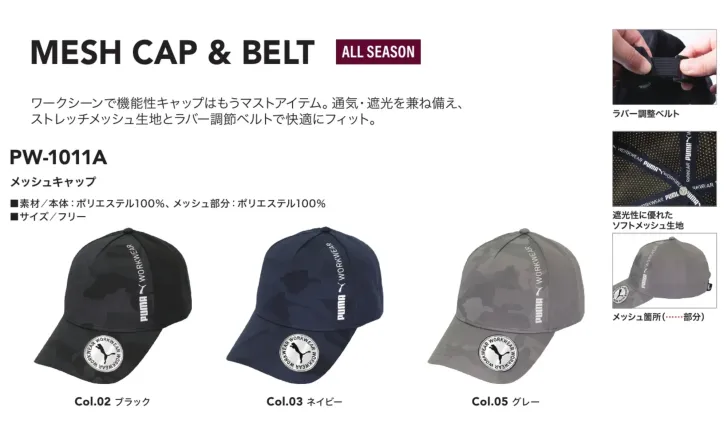 PUMA WORKWEARのメッシュキャップです。通気性と遮光性を兼ね備えたストレッチメッシュ生地を採用し、ラバー調整ベルトにより快適なフィット感を実現します。オールシーズン対応で幅広い作業環境に対応します。