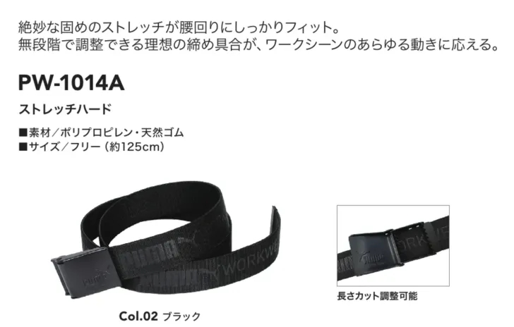 腰回りにしっかりフィットするPUMA WORKWEARのストレッチベルトです。ポリプロピレンと天然ゴムを使用し、無段階でサイズ調整が可能。ワークシーンでのあらゆる動きに対応します。