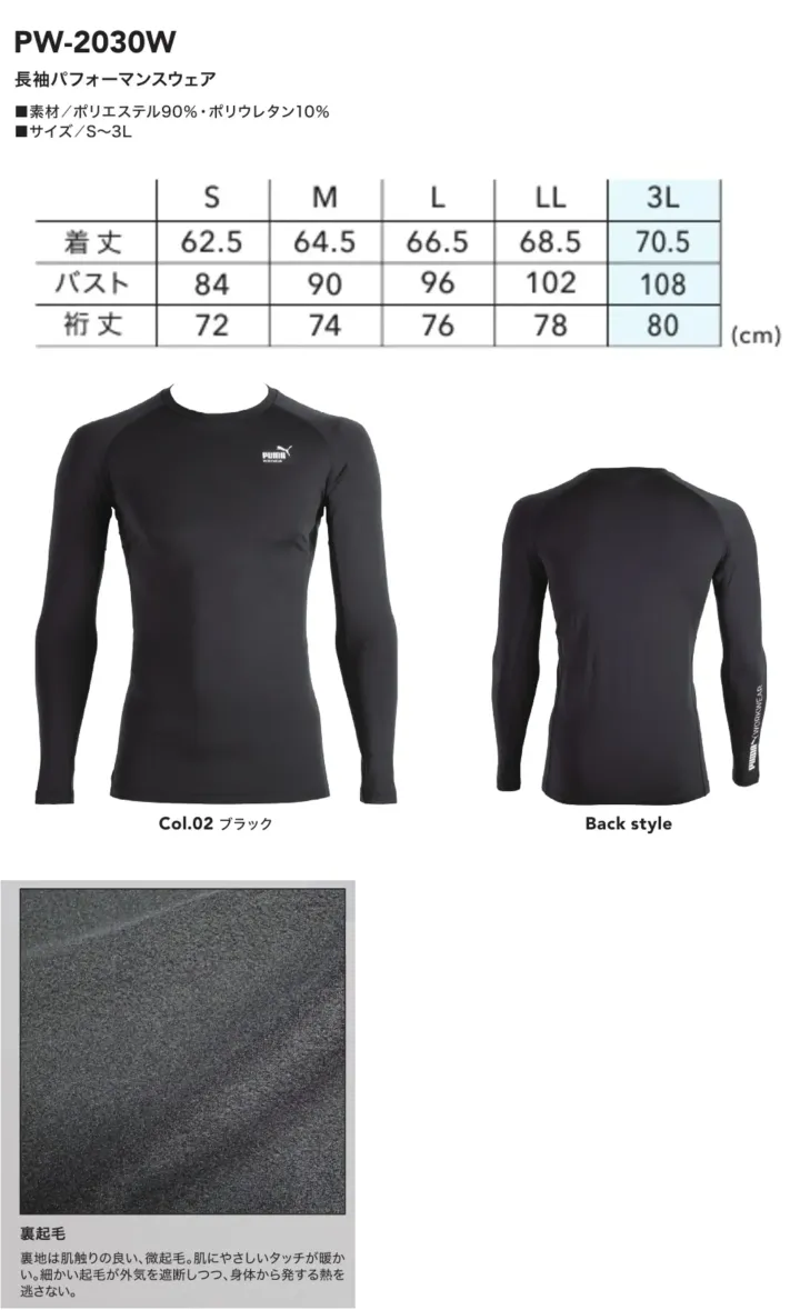 長袖パフォーマンスウェア PUMAPW-2030Wのサイズ表
