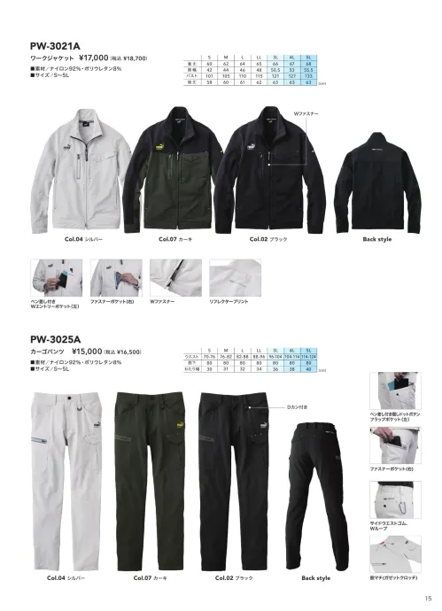 PUMA WORKWEARの3021シリーズとセットアップ対応のカーゴパンツです。伸長率約60%の4WAYストレッチ素材を採用し、しゃがむ・歩く・踏み出すといった動作をスムーズにサポート。快適なフィット感と高い機動力を兼ね備えた一本です。