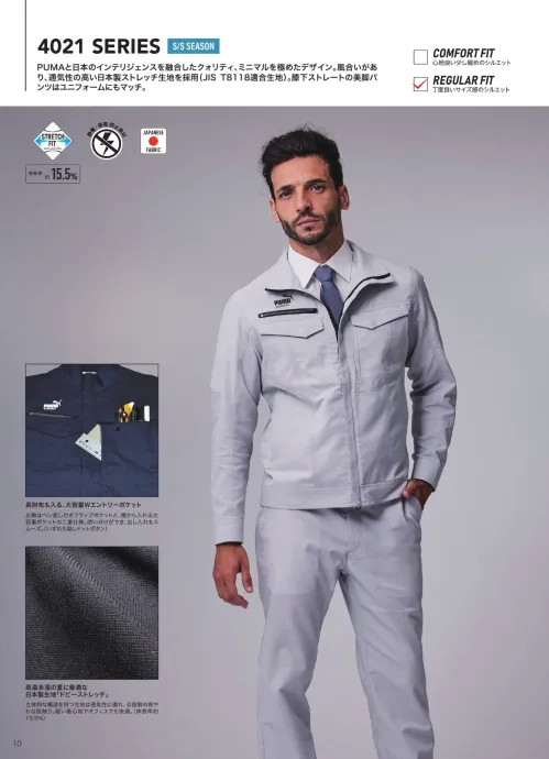 4021 SERIESに連動するカーゴパンツです。日本製ストレッチ素材による高い通気性と制電性能を備え、伸長率約15.5%で動きやすさを追求。サイドウエストゴム仕様により、長時間の着用でも快適なフィット感を保ちます。