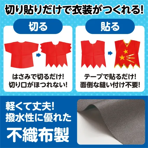 簡単!手間いらず!低価格!あらゆる発表会衣装が5~15分程度で出来上がる!どんな素材も貼付OK!!不織布だから切りっぱなしOK!!幼児~小学校低学年向け