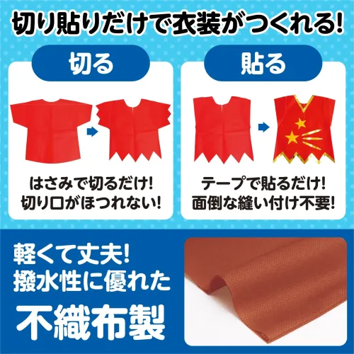 簡単!手間いらず!低価格!あらゆる発表会衣装が5~15分程度で出来上がる!どんな素材も貼付OK!!不織布だから切りっぱなしOK!!3歳くらいの幼児向け