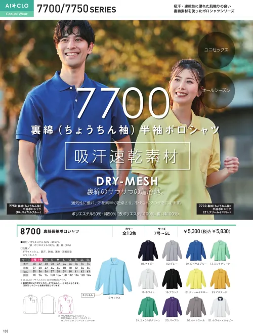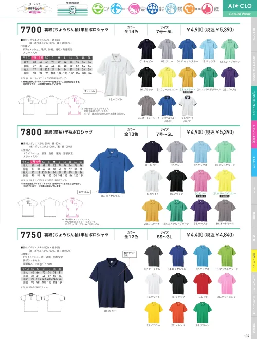 裏綿半袖ポロシャツ 三愛7750-Aのサイズ表