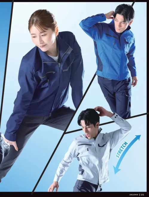 日本製素材のストレッチライトツイルを採用し、伸長率22%以上の高いストレッチ性能を実現。ポリエステル65%・綿35%の最適バランスにより耐久性と着心地を両立し、作業時の腕や肩の動きにもスムーズにフィットするスタイリッシュなワークジャケットです。