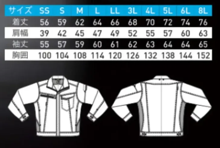 長袖ジャンパー(ユニセックスサイズ) 三愛JA266のサイズ表