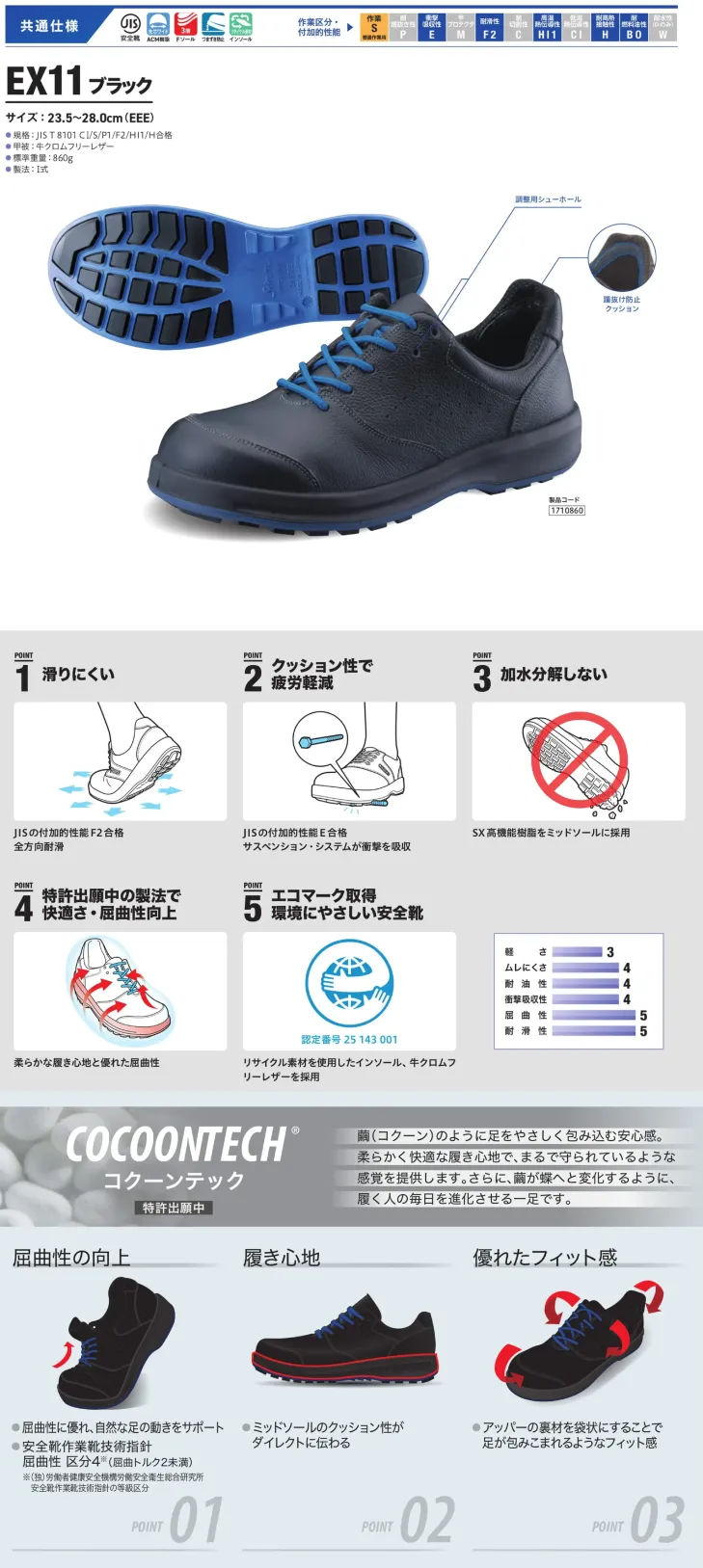 EXシリーズの高品質安全靴で、究極の履き心地を追求した独自製法「コクーンテック」により柔らかく包み込むような安心感と自然な足の動きをサポートします。SX3層底Fソール搭載で優れた耐滑性と衝撃吸収性を発揮し、新設計のラストによりフィット感が大幅に向上。エコマーク認定の環境配慮モデルで、長時間の作業でも快適さが続く一足です。