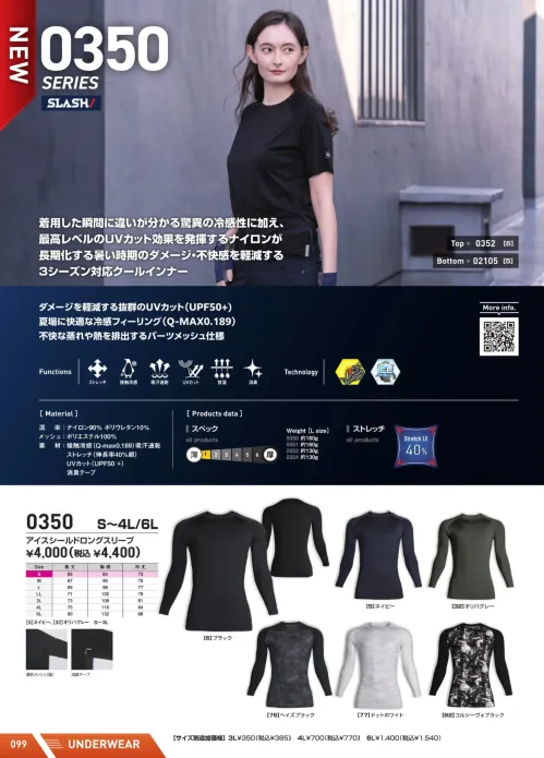 着用した瞬間に違いを感じる接触冷感Q-MAX0.189を備えた0351アイスシールドモックネックロングスリーブ。ナイロン90%ポリウレタン10%の高伸縮素材で伸長率約40%を実現。UVカットUPF50+機能が強い日差しから肌を守り暑い季節の不快感を軽減します。