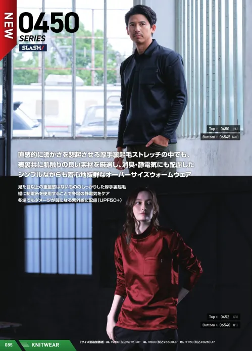 直感的に暖かさを想起させる厚手裏起毛ストレッチの中でも、表裏共に肌触りの良い素材を厳選し、消臭・静電気にも配慮したシンプルながらも着心地抜群なオーバーサイズウォームウェア