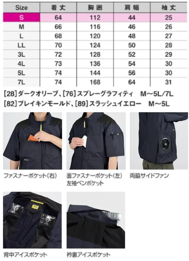 ・サイズ:S~5L/7L ※28.ダークオリーブ、76.スプレーグラフィティはM~5L/7L ※82.ブレイキンモールド、89.スラッシュイエローはM~5L