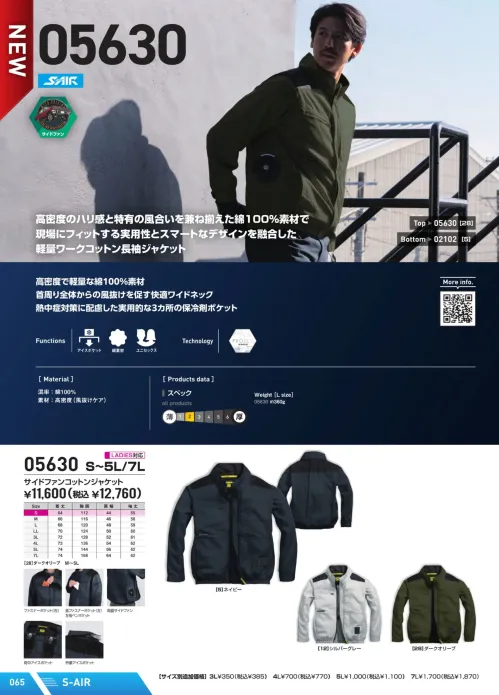 高密度でハリ感のある綿100%素材を使用した05630サイドファンコットンジャケット。軽量約360gの設計で快適性を確保し首元から風を抜けさせるワイドネック仕様を採用。保冷剤ポケット付きで熱中症対策にも配慮した実用派モデルです。