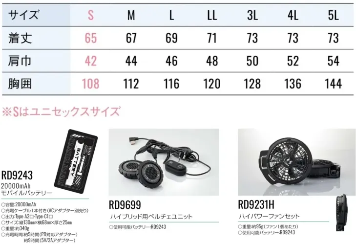 ・セット内容:ウェア EF92692N、モバイルバッテリー RD9243、ペルチェデバイス RD9699、ファン RD9231H
