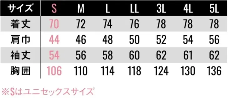 ・サイズ:S~5L(Sはユニセックスサイズ)
