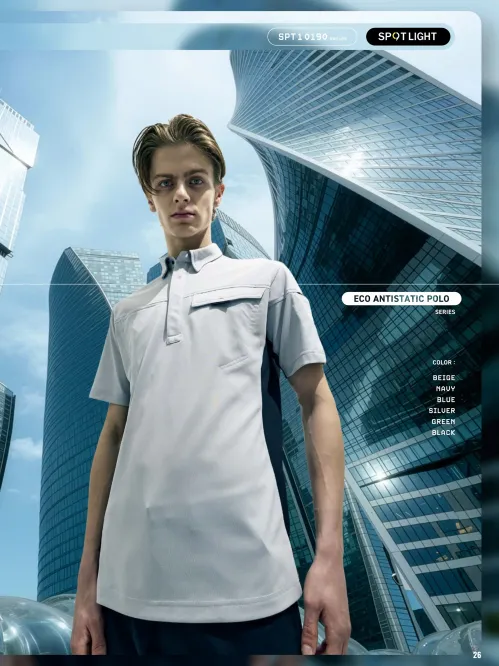 ビジネス対応の端正な印象と現場対応力を兼ね備えた高機能ポロシャツ。JIS T 8118適合の帯電防止性能に加え、可動域を妨げない高ストレッチ素材を採用し、長時間の着用でも快適さをキープ。製造業や運送業はもちろん、来客対応やオフィスシーンまで幅広く活躍します。