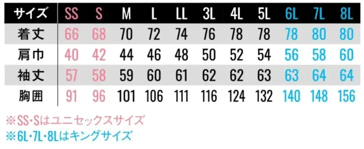 ・サイズ:SS~5L・6L・7L・8L(SS・Sはユニセックスサイズ、6L・7L・8Lはキングサイズ)