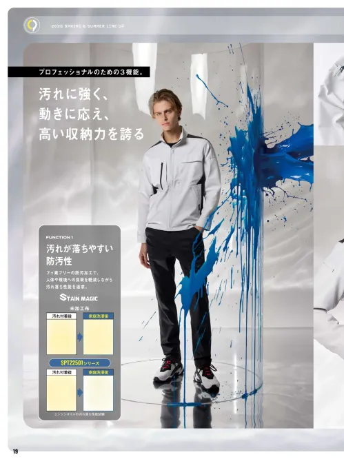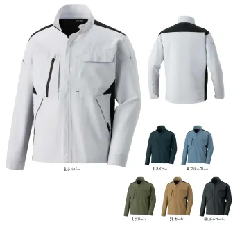 バネのように伸び、軽やかにフィット。接触冷感の高通気素材で、さらなる快適をプラス。高通気かつ軽量なジェットエアー素材を採用し、動きやすさと涼しさを両立。JIS T 8118適合の制電性能と防汚加工により、ハードな作業環境でも清潔感と快適性をキープします。