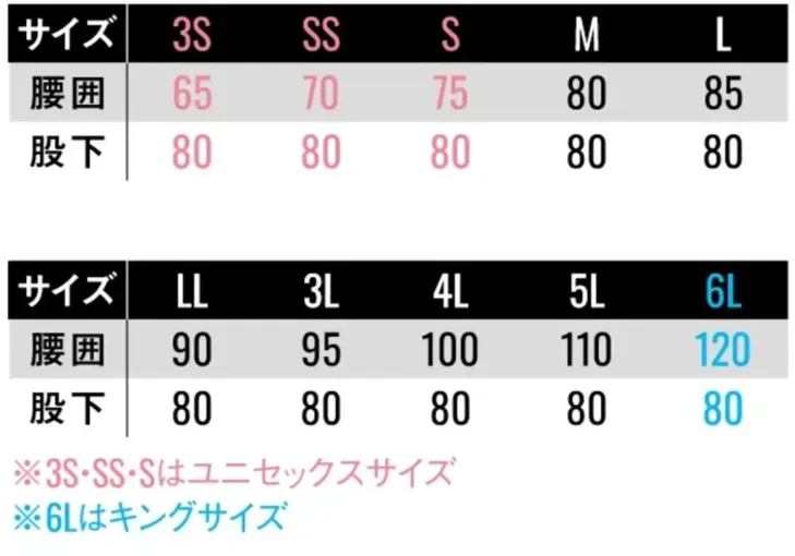 ・サイズ:3S~6L(3S・SSはユニセックスサイズ、6Lはキングサイズ)