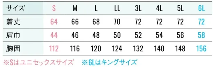 フルハーネス用エコベスト(ファン・バッテリー別売) 空調風神服KF92652Gのサイズ表