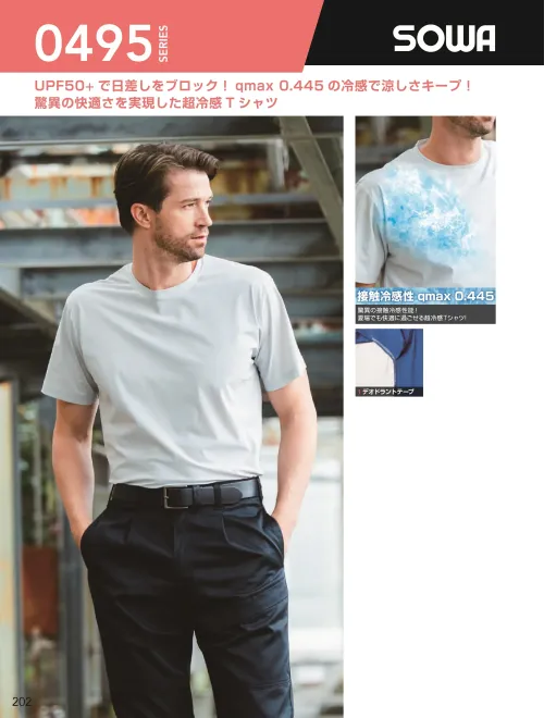 驚きの接触冷感を実現した0495-63 半袖Tシャツ。qmax0.445の高い接触冷感性能とUPF50+のUVカット機能により強い日差しの現場でも快適な着心地をキープします。縦横に伸びる高ストレッチ素材と吸汗速乾機能で動きやすくドライな着用感を維持。デオドラントテープ付きで作業中の不快なニオイも軽減します。