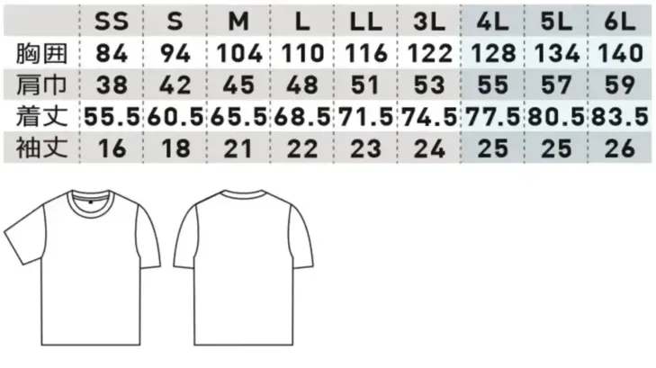 半袖Tシャツ(胸ポケット無) 桑和0495-63のサイズ表