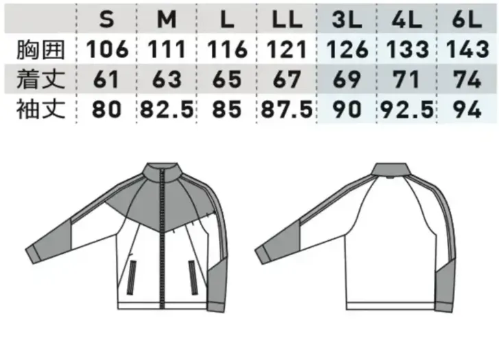 長袖ブルゾン 桑和0648-00のサイズ表