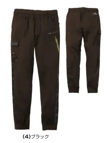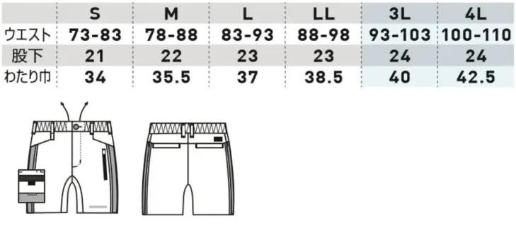 ■形状特長ノータック|ウエスト総ゴム|フロントファスナー|両脇ポケット|カーゴポケット(野帳対応)|ファスナーポケット(野帳対応)|バックポケット|カラビナループ|反射パイピング|デオドラントテープ