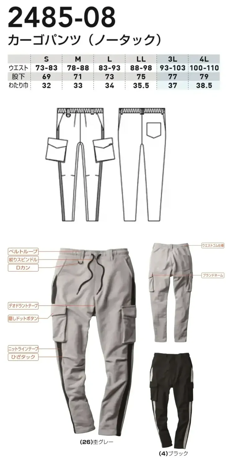 カーゴパンツ(ノータック) 桑和2485-08のサイズ表