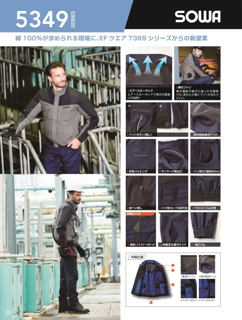綿100%素材を採用したSOWA 5349シリーズのEFベスト。肌触りと吸湿性に優れた天然素材に加え裏UVコーティング加工を施し、空調効果を高めるエアースルーネック構造を採用。横付けファン仕様により作業時の干渉を軽減し、夏の現場作業を快適にサポートするファン対応ワークウェアです。