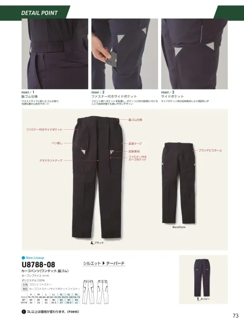■形状特長テーパードシルエット|ワンタック|脇ゴム仕様|ファスナー付きサイドポケット|ファスナー付きカーゴポケット|右脚部分ペン差し|反射素材|股部分デオドラントテープ|ブランドピスネーム