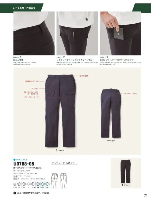 ■形状特長ノータック|脇ゴム仕様|両脇斜めポケット|フラップ付きカーゴポケット|右部分隠しファスナー付きカーゴポケット(ペン差し付き)|股部分デオドラントテープ|ブランドピスネーム|レギュラーシルエット