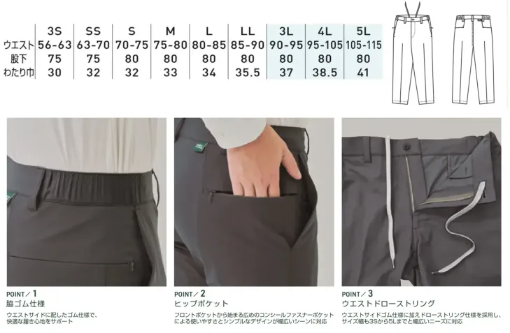 ■形状特長テーパードシルエット|ノータック|脇ゴム仕様|ドローストリング仕様|両側ウエストアジャスター|両脇斜めポケット|ファスナー付き両ヒップポケット|デオドラントテープ|男女兼用