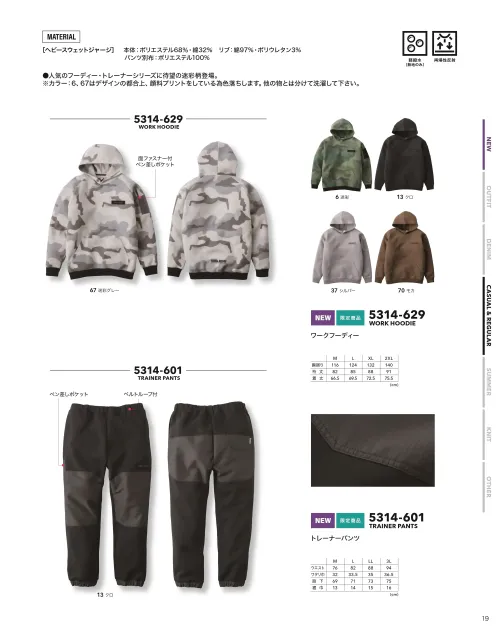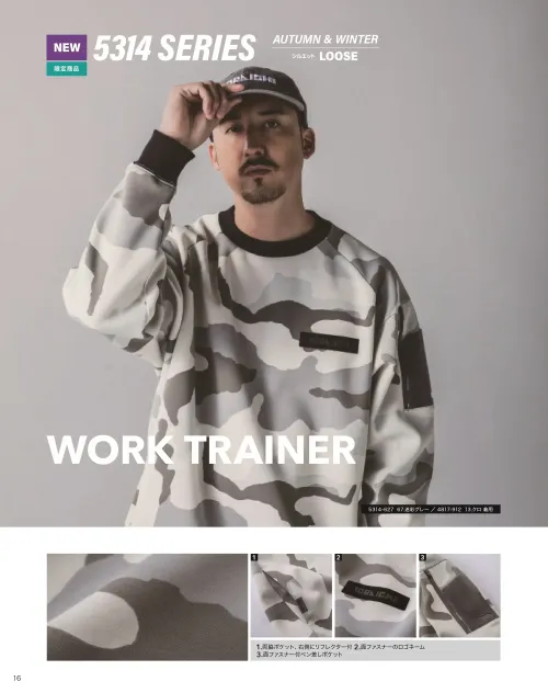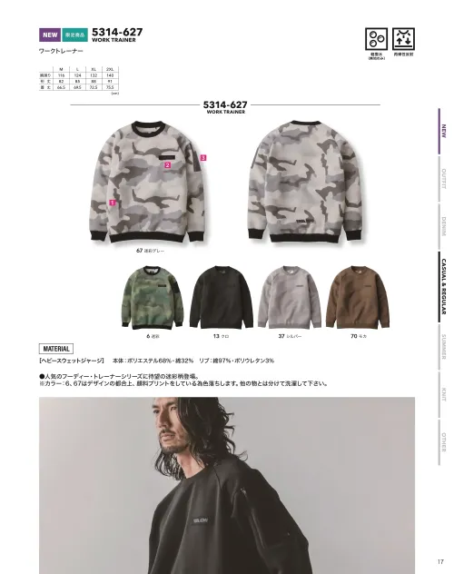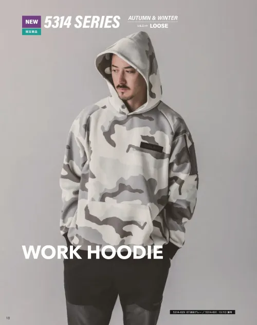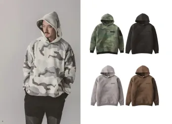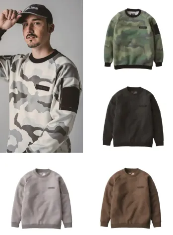 人気のフーディートレーナーシリーズに待望の迷彩柄パンツが登場。ポリエステル68%・綿32%のヘビースウェットジャージ素材を使用し、リブ部分には綿97%・ポリウレタン3%の伸縮性に優れた素材を採用しました。ゆったりとしたシルエットと動きやすい設計で、作業現場での快適な着用感と実用性を兼ね備えたパンツです。