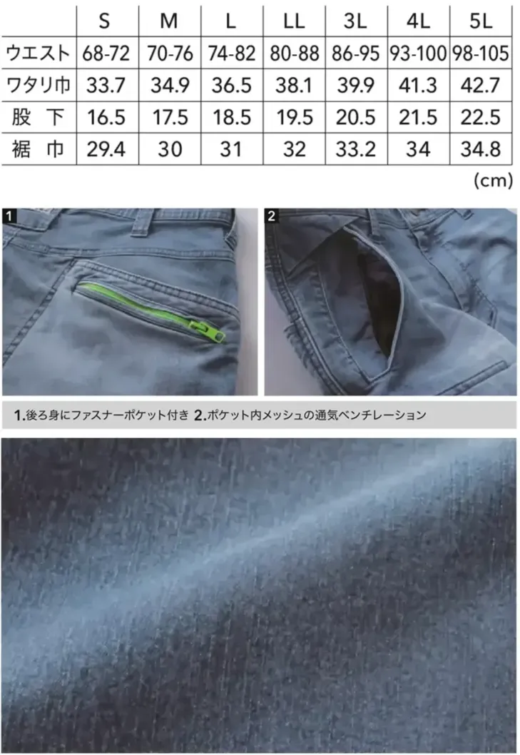 ストレッチ性に優れた8923 SERIESのデニムカーゴハーフパンツ。綿75%・ポリエステル23%・ポリウレタン2%の7ozストレッチデニムを採用し、動きやすさと耐久性を両立。通気ベンチレーションやファスナーポケット付きで、現場作業から普段使いまで快適なはき心地を実感できます。
