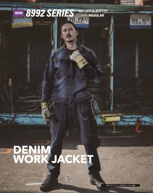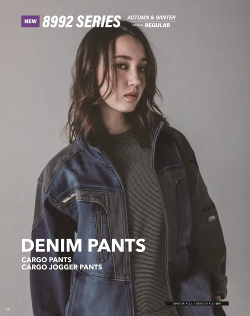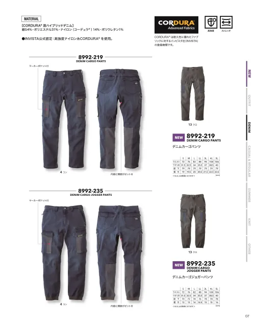 ハイブリッドデニムの新素材CORDURA®を採用した8992シリーズのデニムカーゴジョガーパンツです。INVISTA公式認定の高強度ナイロン糸を使用し、綿54%・ポリエステル31%・ナイロン14%・ポリウレタン1%の配合により、デニムの風合いと機能性を両立。裾がすっきりとしたジョガータイプで動きやすく、内股に膝部分がずれにくい補強パッドを装備した機能的なパンツです。