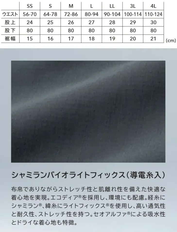■素材特長導電糸入 静電気帯電防止 JIS T8118適合 通気性 耐久性 ストレッチ 吸汗速乾 軽量 エコ素材