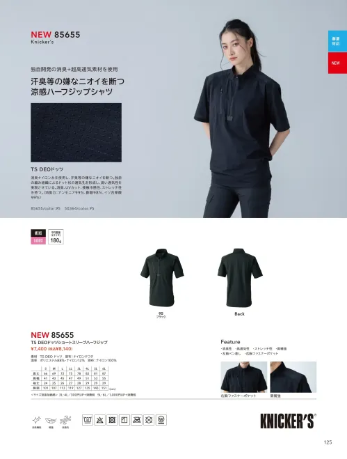 独自開発のTS DEOドッツ素材を採用した涼感ハーフジップシャツ。ポリエステル88% ナイロン12%の超高通気メッシュ構造で軽量約180gを実現。アンモニア99% 酢酸98% イソ吉草酸99%の消臭性能で汗臭を抑え春夏の現場を快適に保ちます。