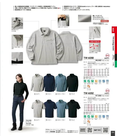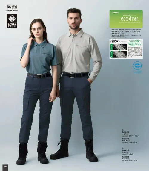 TAKAYA WORK WEAR TW-ECOシリーズの半袖ポロシャツ。東レの植物由来ポリエステル「エコディア®」を使用したポリエステル100%素材で環境配慮と高機能を両立。4WAYストレッチと吸汗速乾性により動きやすく快適な着心地を実現します。
