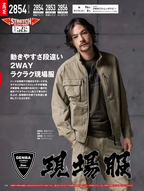 ■形状特長両胸縦型ファスナーポケット(巾14cm×深さ26cm)|右胸フラップポケット(巾12cm×深さ15cm)|左袖ペン差し|裾・袖口2段階調整アジャスター付き|袖3Dカット