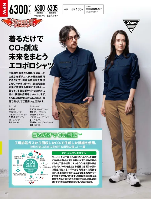 着るだけでCO2削減に貢献するエコ素材を採用した長袖ポロシャツ。工場排出ガス由来のCO2から生成されたポリエステル100%素材を使用し、JIS T8118帯電防止にも対応。伸縮性と吸汗速乾性を兼ね備え、快適な着心地と環境配慮を両立した一着です。