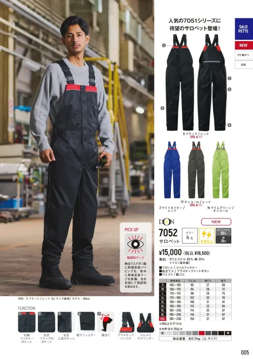 人気の7051シリーズから登場した待望のサロペットモデル。ポリエステル65%・綿35%のツイル素材を採用し、耐久性と軽快な着用感を両立。再帰反射パイピングにより視認性を高め、現場での安全性と動きやすさを兼ね備えた一着です。