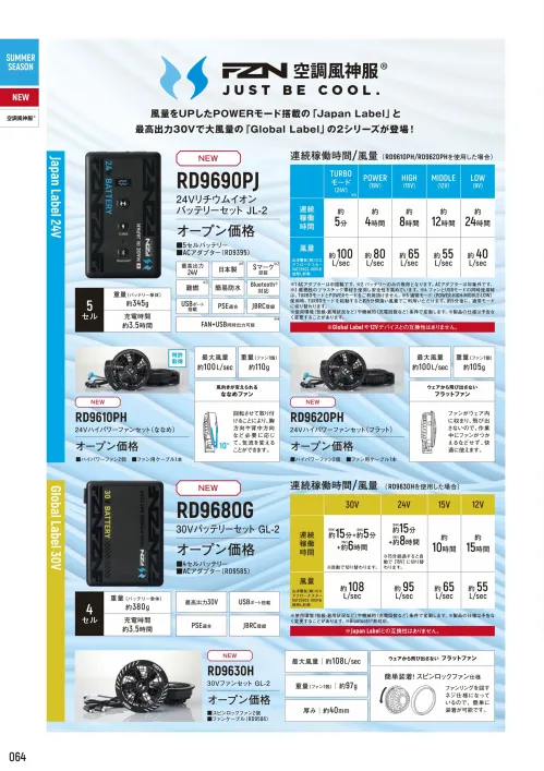 ・バッテリー使用時動作時間(RD9690PJ使用時):TURBO 24V 約5分|POWER 19V 約4時間|HIGH(強) 15V 約8時間|MIDDLE(中) 12V 約12時間|LOW(弱) 9V 約24時間